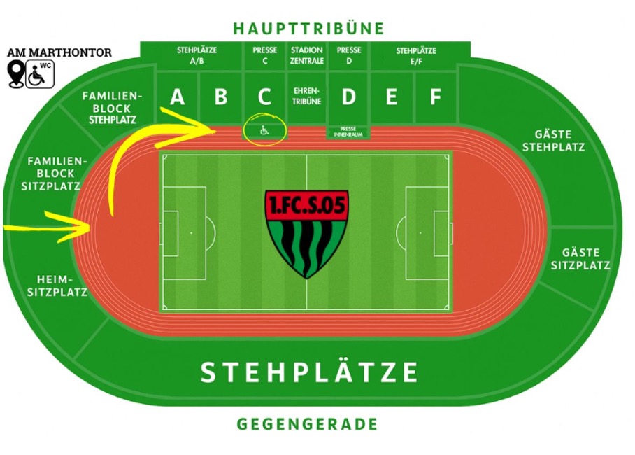 | Hier sind die Plätze im Stadion:Im Stadion gibt es 18 Plätze für Menschen im Rollstuhl. Die Plätze sind im Stadioninnenraum Auf dem Bild kannst du sehen: | Image   |
